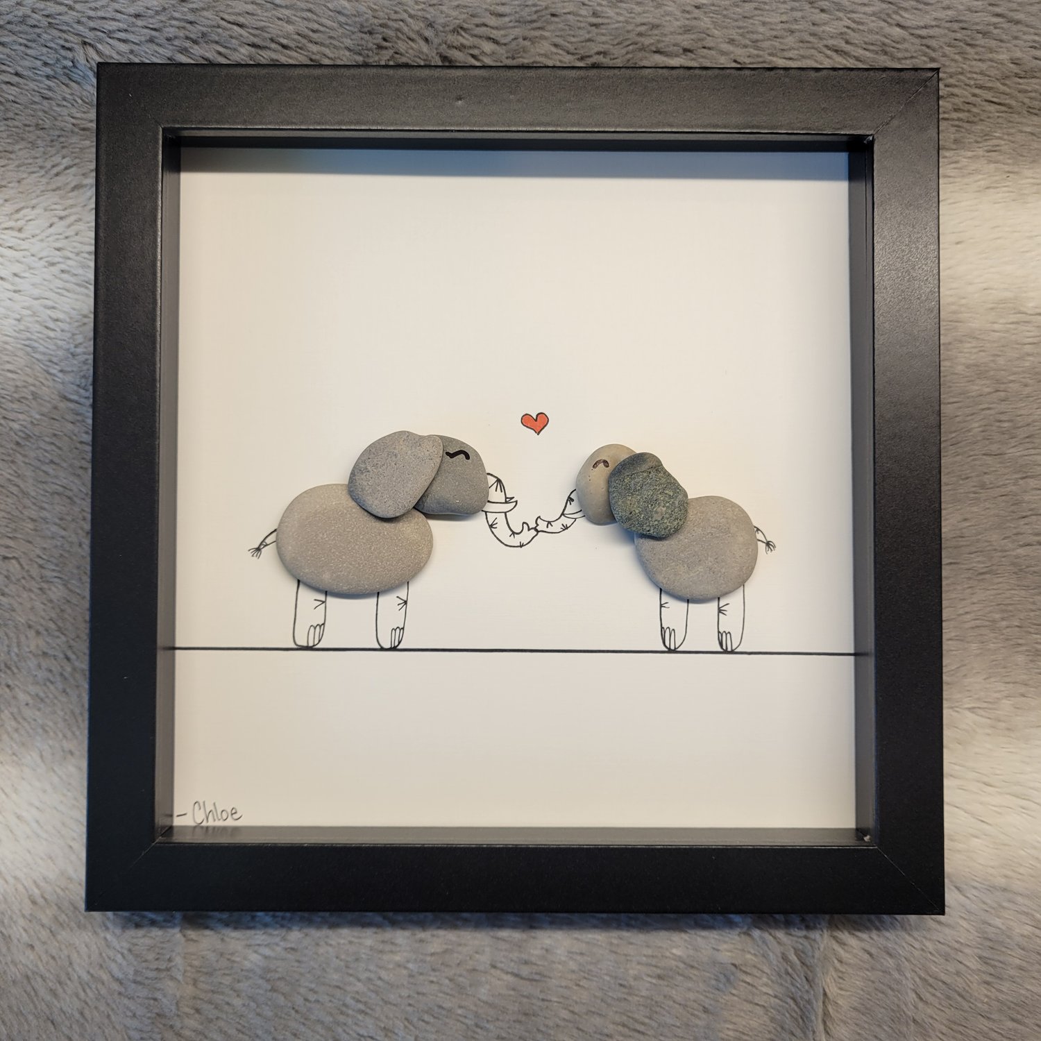 Pebble art of a pair of elephants.